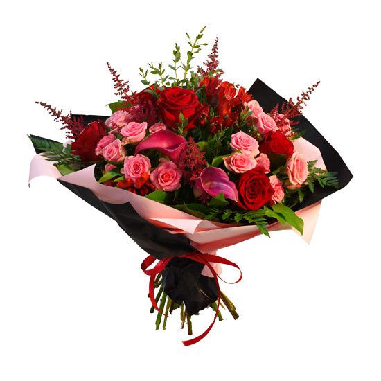 Bukiet składający się z czerwonych i różowych róż, frezji (sezonowo), i tawuły z dodatkiem paproci pteris, w eleganckim opakowaniu.