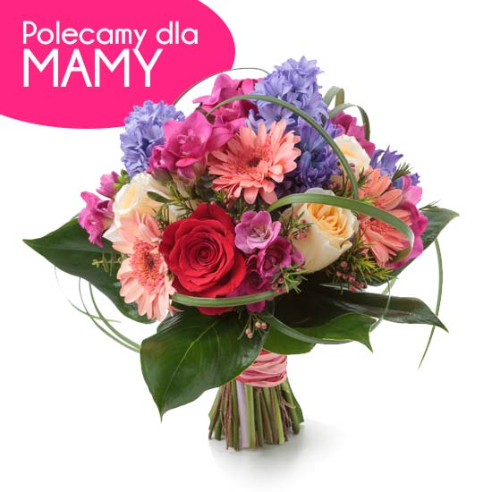 Bukiet składający się z róż czerwonych i żółtych, gerber, hiacyntów lub lewkonii, alstromerii z dodatkiem liści aralii i trawy niedźwiedziej. Piękny bukiet dla każdego.