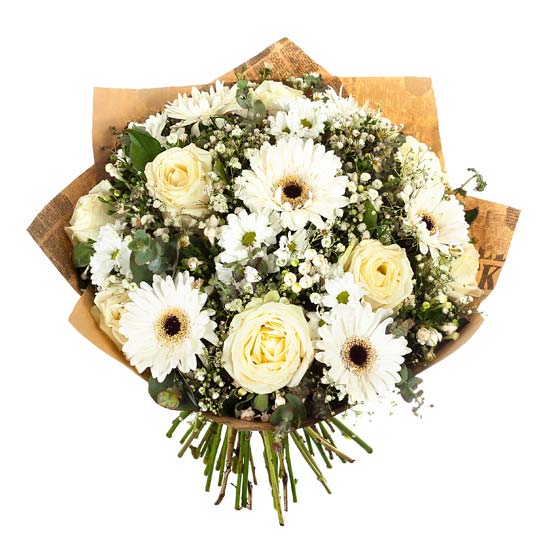 Bukiet kwiatów w kolorystyce kremowej i białej, składający z róż, margaretek i gerber z dodatkiem zieleni ozdobnej i gipsówki, owinięty w papier eco. Piękna jasna kolorystyka bukietu doskonała na każdą okazję.