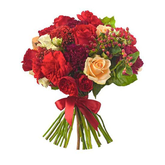Bukiet składający się z czerwonych róż, czerwonych goździków, przełamany jasną różą z liśćmi salalu i czerwoną wstążką.