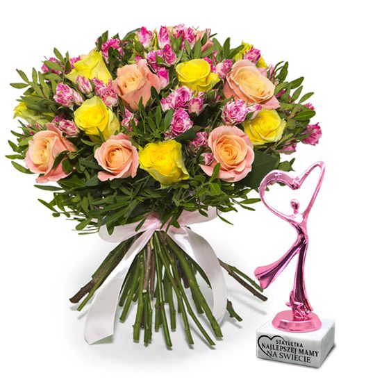 Bukiet składa się z róż klasycznych i gałązkowych z dużą ilością liści pistacji. Do zestawu dołączona jest statuetka Najwspanialszej Mamy. Kwiaty z dostawą.