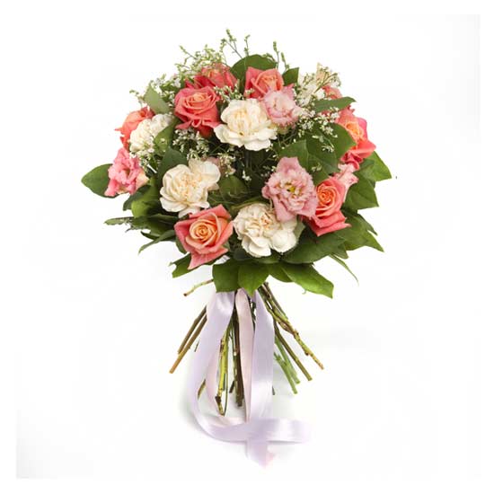 Bukiet składający się z kolorowych róż, goździków z dodatkiem limonium. Piękna kompozycja przewiązana wstążką.