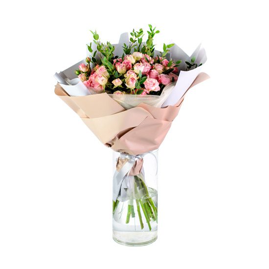 Bukiet składający się z delikatnych róż gałązkowych otulony papierem Eco w naturalnym kolorze. Kompozycja kwiatów na każdą okazję.