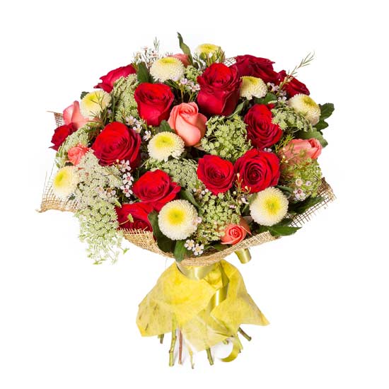Bukiet składający się z chryzantemy, róż czerwonych i różowych z dodatkie zieleni ozdobnej, owinięty jutą.