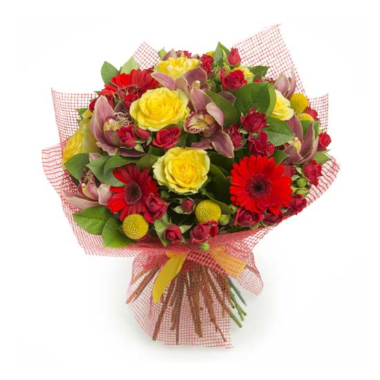 Bukiet składający się z żółtych i różowych róż, gerber i storczyków (sezonowo) w kolorowej siatce.