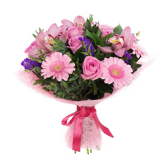 Bukiet składający się z różowych róż, gerber oraz irysa (sezonowo) z dodatkiem liści pistacji.