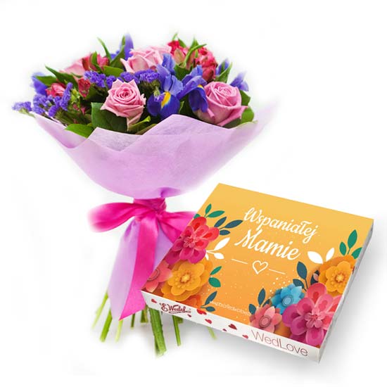 Bukiet różowych róż, alstromerii i irysów (sezonowo) z dodatkiem zatrwianu i salalu + personalizowane czekoladki pralinki ” Wspaniałej Mamie”