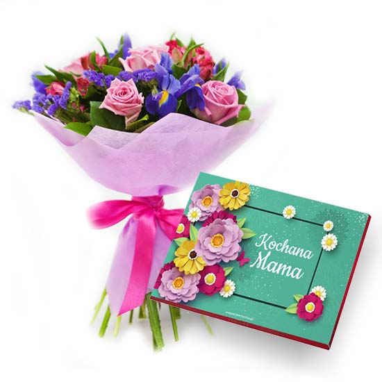 Bukiet różowych róż, alstromerii i irysów (sezonowo) z dodatkiem zatrwianu i salalu + personalizowane czekoladki Merci ” Kochana Mama”