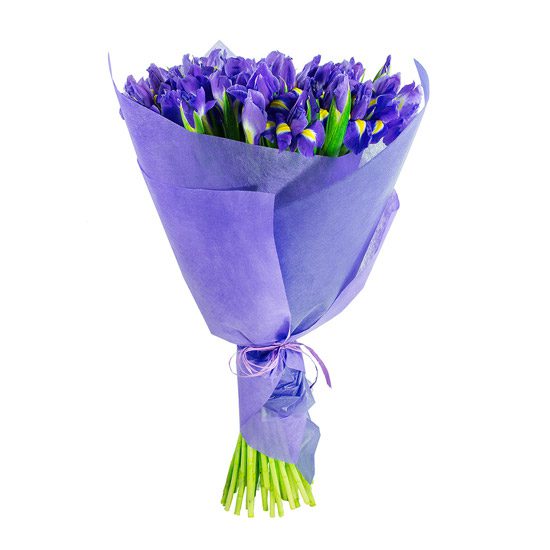 Bukiet składający się z irysów syberyjskich, owinięty kryzą. BUKIET SEZONOWY.