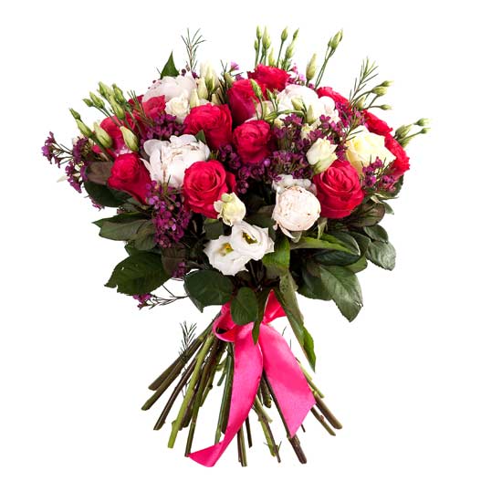 Kolorowy bukiet składający się z białych eustom i czerwonych róż z dodatkiem vaxu w zielonej otulinie z wstążką.