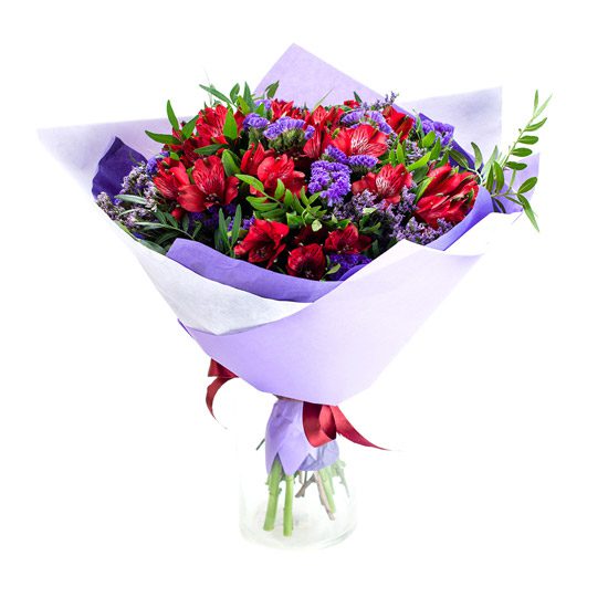Bukiet składający się z alstromerii i zatrwianu, utrzymany w kolorystyce czerwono fioletowej, otulony kryzą z papieru ozdobnego.