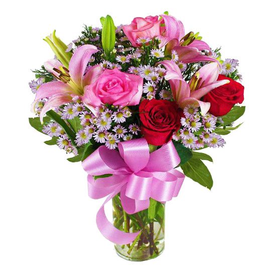Bukiet składający się z lilii, róż w kolorze czerwonym i różowym z dodatkiem santini lub zamiennie gipsówki.