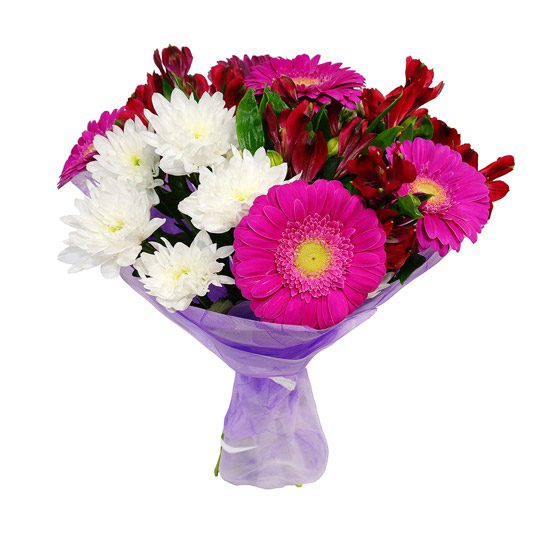 Bukiet składający się z różowych gerber, alstromerii i białych margaretek, owinięty papierem w kontrastowym kolorze.