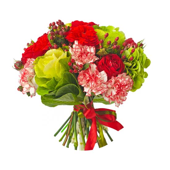 Bukiet w skład którego wchodzą róże w dwóch kolorach, goździki i kapusta ozdobna z dodatkiem kawy i wstążką ozdobną.