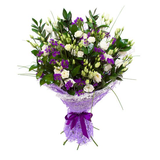 Bukiet składający się z białych eustom z fioletowym dodatkiem np. zatrwianu i dodatkiem zieleni, owinięty siatką w podobnym odcieniu.