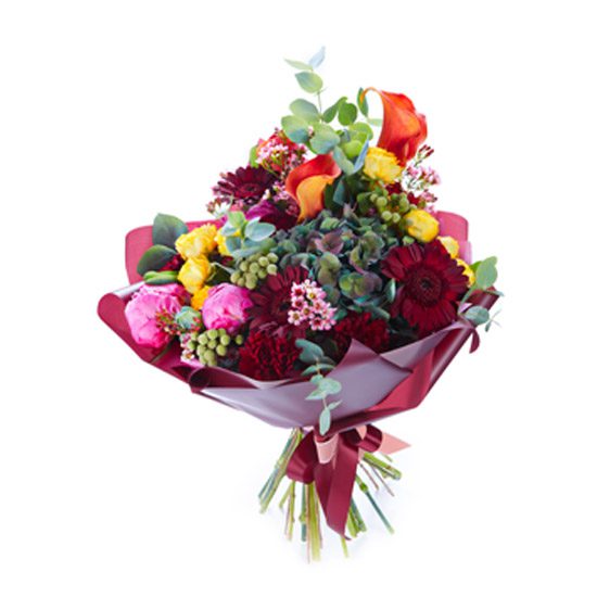 Bukiet składający się z calle, gerber, goździków, róż i kwiatów sezonowych z dodatkiem eukaliptusa w ciemnej oprawie.
