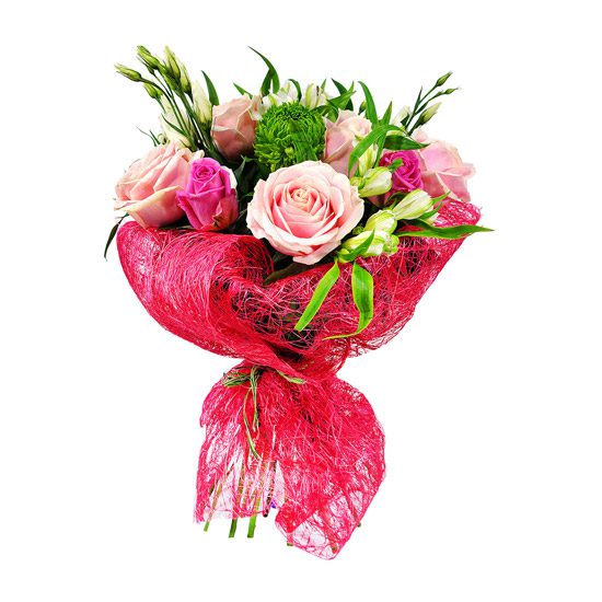 Bukiet składający się z róż w dwóch odcieniach, eustom, alstromerii i santini w romantycznej czerwonej owijce.