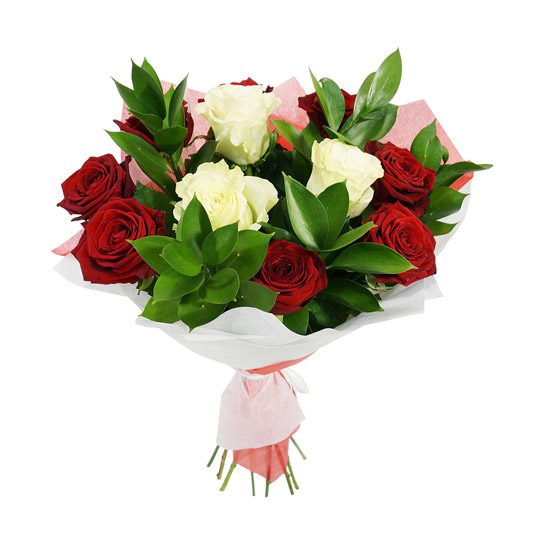 Bukiet składający się z czerwonych i białych róż z dodatkiem ruskusa w jasnej kryzie.