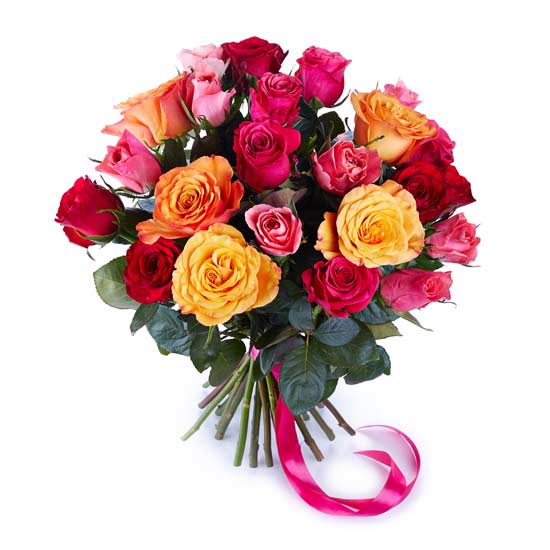 Bukiet składający się z kolorowych róż przewiązany wstążką. Idealny prezent niespodzianka na każdą okazję dla niej i dla niego.