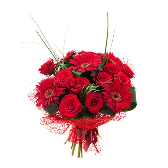 Bukiet w czerwonej kryzie, składający się z czerwonych róż i gerber z liśćmi aspidistry i zielenią ozdobną.
