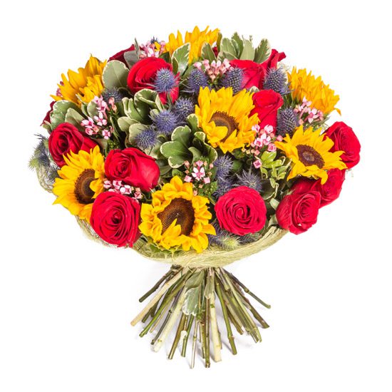 Bukiet Wiosenna Euforia, w skład którego wchodzą słoneczniki, czerwone róże, niebieskie mikołajki, vax, bukiet w jasnej kryzie. Bukiet sezonowy.