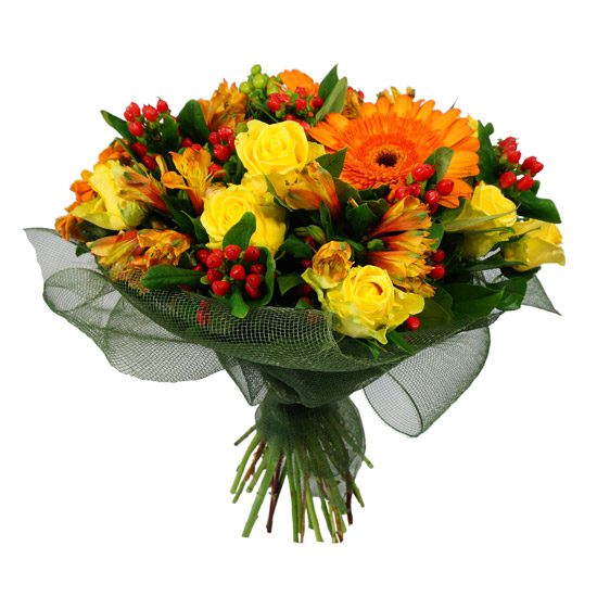 Bukiet składa sie z alstromerii, gerber i róż w tonacji żółto pomarańczowej z dodatkiem kawy i siatki ozdobnej.