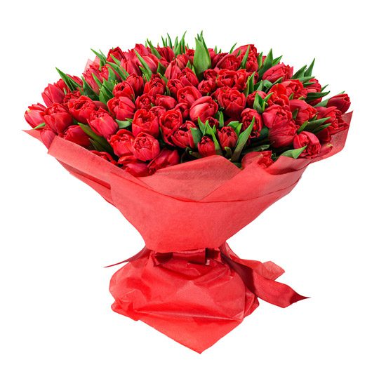 Bukiet składający się z czerwonych tulipanów, owiniętych czerwonym papierem, kwiaty pochodzą od lokalnych ogrodników.