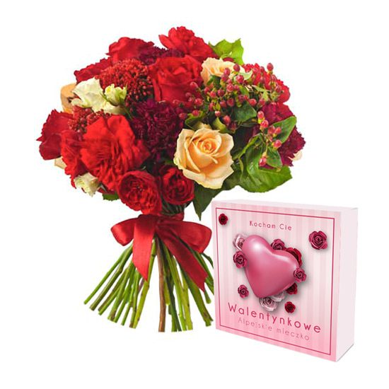 Bukiet składający się z czerwonych róż, czerwonych goździków, przełamany jasną różą z liśćmi salalu i czerwoną wstążką. Dodatkowo bukiet występuje w zestawie z Pralinkami Wedel Od Serca.