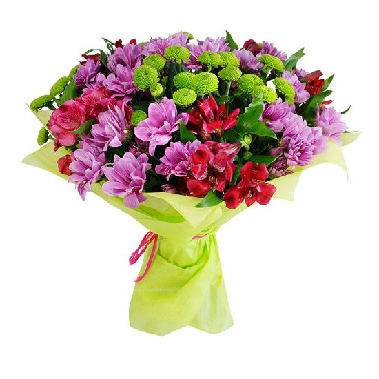 Bukiet składający się z fioletowych margaretek, zielonych santini, czerwonych alstromerii w zielonej flizelinie.