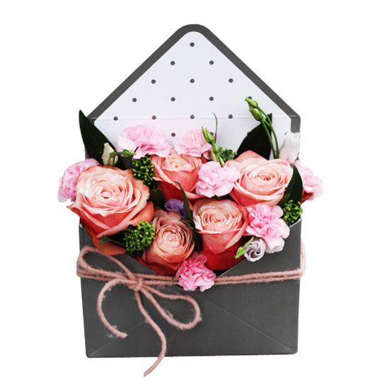 Pudełko w kształcie koperty. W skład kompozycji wchodzą róże, goździki i goździki mini.