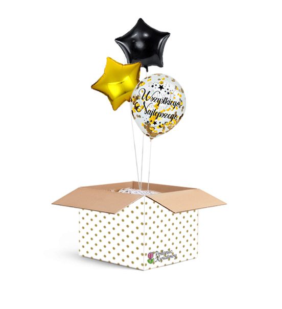 Balon w ksztalcie gwiazdy x2 i owalny x1 z napisem „Wszystkiego Najlepszego”. Balony doręczamy w eleganckim pudełku.