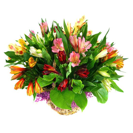 Kosz pełen kolorowych alstromerii z dodatkiem ozdobnej zieleni.