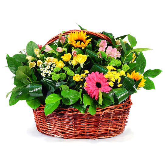 Kosz misz masz kolorowych kwiatów, z powywijanymi liśćmi aspidistry i salalu.