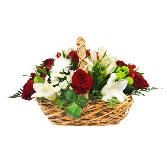 Kosz czerwonych róż i białych lilii z dodatkiem santini i liści paproci.