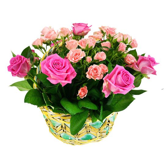 Tradycyjna róża i róża gałązkowa w dwóch tonacjach różu umieszczone w kolorowym koszyku z dodatkiem delikatnej zieleni.