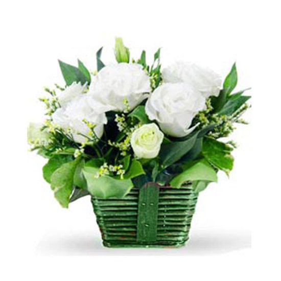 Kosz białych kwiatów, w skład kompozycji wchodzą: róże, eustomy i białe limonium.