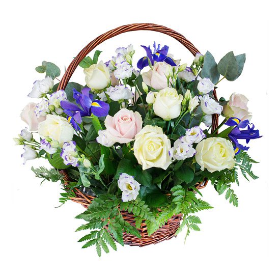Stylowy kosz z różami, biało fioletową eustomą, irysami (sezonowo), paprocią i eukaliptusem w lekkim ułożeniu.