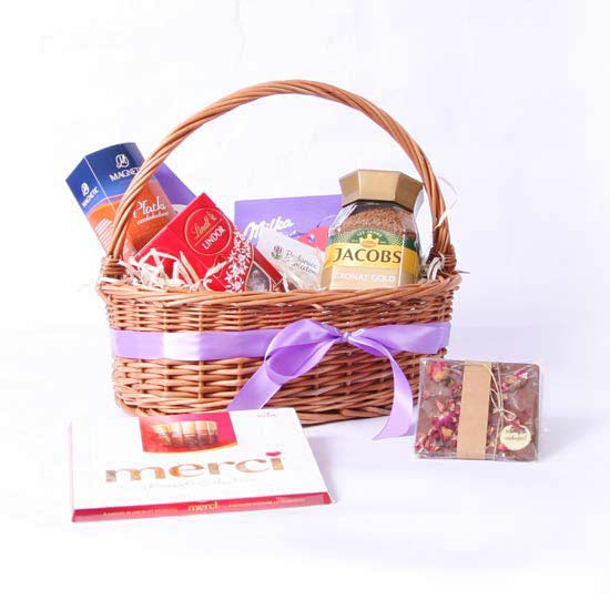 Kosz upominkowy pełen słodkości, jest to wspaniały pomysł na prezent niespodziankę, może być idealnym podarunkiem na każdą okazje: urodziny, podziękowanie, wyznanie i wiele innych.