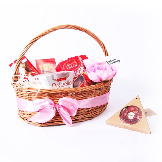Kosz upominkowy pełen słodkości, jest to wspaniały pomysł na prezent niespodziankę, może być idealnym podarunkiem na każdą okazję: urodziny, podziękowanie, wyznanie i wiele innych.