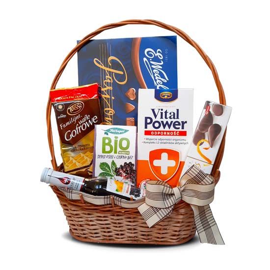 to zestaw produktów ręcznie pakowanych w koszyku wiklinowym.