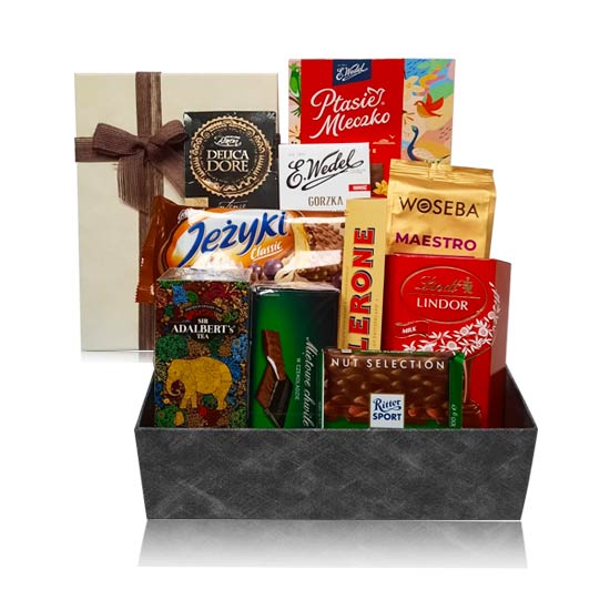 Pudełko upominkowe pełne słodkości, jest to wspaniały pomysł na prezent niespodziankę, może być idealnym podarunkiem na każdą okazję: urodziny, podziękowanie, wyznanie i wiele innych.