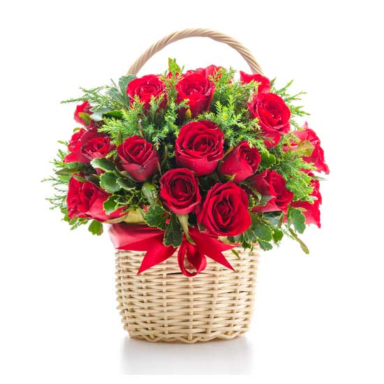 Kosz zawiera kompozycję składającą się z czerwonych róż z dodatkiem zieleni dekoracyjnej.