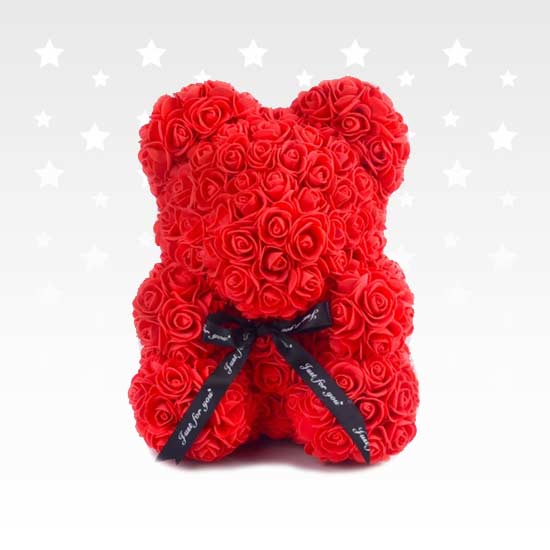 Miś wykonany jest z różyczek piankowych, w kolorze czerwonym, w pudełku transparentnym. Miś z róż to wspaniały pomysł na prezent.