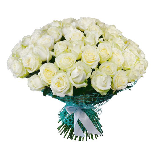 21 x Białe róże – 60cm związane rafią w kolorystyce dobranej przez florystę.