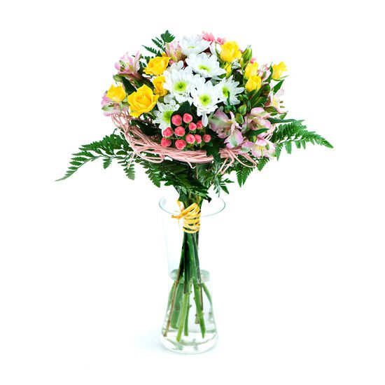 Bukiet składający się z alstromerii, kawy, margaretek i róż, wykończony liśćmi paproci z rattanową obręczą.