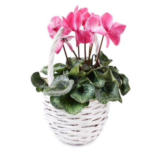 Kwiat doniczkowy fiołek cyklamen w koszyczku, kolor różany dostępny w kwiaciarni.