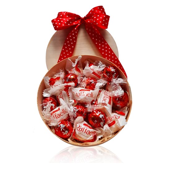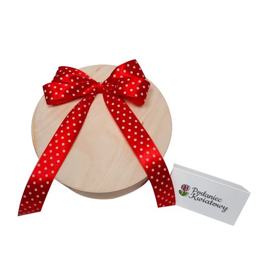 Upominek w postaci ozdobnego pudełka wypełnionego pralinkami z wstążką ozdobną. Bilecik z życzeniami gratis do każdego zamówienia.