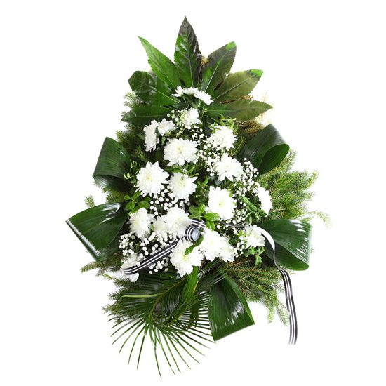 Wiązanka pogrzebowa na igliwiu, w skład którego wchodzą białe margaretki z dodatkiem zieleni ozdobnej i gipsówki.