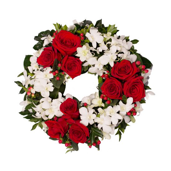 Wieniec na obręczy o średnicy 55cm, w skład którego wchodzą czerwone róże i białe margaretki, kawa i zieleń ozdobna.