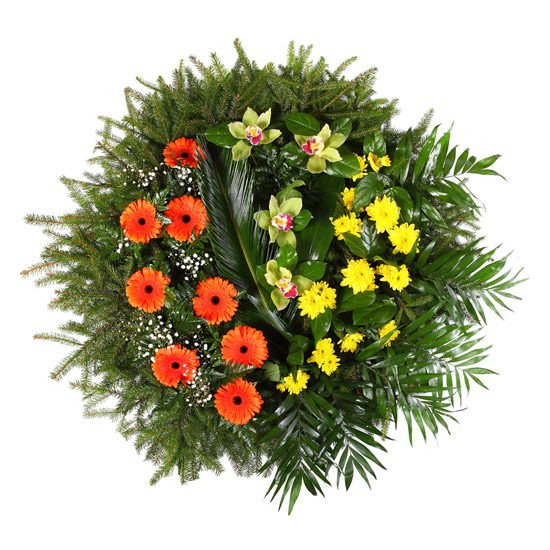 Wieniec na obręczy o średnicy 1m, w skład wchodzą gerbery, żółte margaretki i storczyki cymbidium oraz zieleń ozdobna.